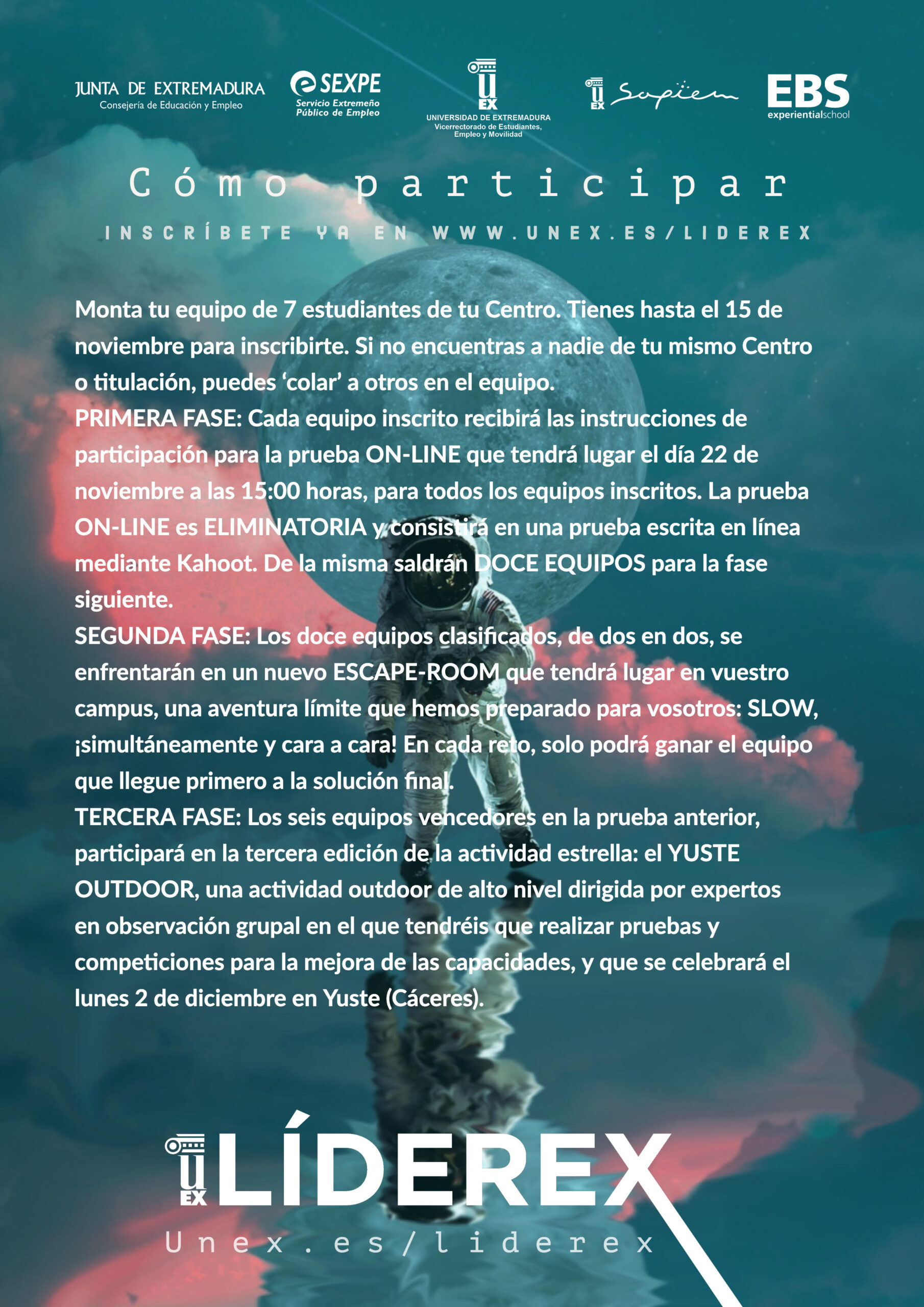 Formación experiencial para tiLa Universidad de Extremadura presenta la XV edición del programa LÍDEREX 2019, para la mejora de las capacidades y las competencias de jóvenes como tú que deseen no solo dar valor a qué son, sino a quiénes son. De la mano de un equipo entusiasta de profesores y otros expertos en observación grupal, y con técnicas outdoor y experienciales, ofrecemos a los participantes un verdadero RETO en el que el protagonismo recaerá en cada uno de los equipos.